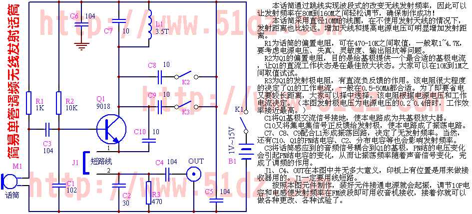 MIC是驻极体话筒,它的作用就是感应空气中声波的微弱振动,并输出跟声音变化规律一样的电信号。本站选用的是灵敏度较高的话筒,一般可以输出几十毫伏以上的音频信号,这个信号足以调制下一级的高频振荡信号的频率。注意:话筒有正负极之分,一般和外壳相通的是负极。 R1是MIC驻极话筒的偏置电阻,有了这个电阻,话筒才能输出音频信号,这是因为MIC话筒内部本身有一极场效应管放大电路,用来阻抗匹配和提高输出能力等作用。注意:话筒不要选灵敏度太高的话筒,否则容易出现声反馈,出现自激叫声。 C2是音频信号耦合电容,将话筒感应输出的声音电信号专递到下一级。 C3是Q9018的基极滤波电容,一方面滤除高频杂音,另一方面让Q9018的高频电位为0,对50MHz以上的高频电路来说,Q9018是一个共基极放大电路,这是最后能形成振荡的基础。因为振荡电路的基础条件就是必须具备一定的增益,再就是具备合适相位的反馈(一般是正反馈)。 R2是Q9018的基极偏置电阻,给Q提供一个较小的基极电流,Q将会有一个较大的发射极电流到过R3。由于R2、R3中的电流作用会在各自电阻上产生压降并互相影响,结果会自动稳定在某一数值状态,这就是书上讲的射极跟随器,直流负反馈不稳定直流工作点的作用。 R3是Q9018的发射极电阻,这里起稳定直流工作点作用,和C7还组成了高频信号负载电阻作用,也是整个高频振荡回路的一部分。 C4和L组成并联谐振回路,起到选择振荡频率的主要作用,改变C4的容量或者改变L的形状(包括圈数),可以方便的改变发射频率。 C6是高频信号输出耦合电容,目的是为了让高频信号变成无线电波幅射到天空中。因此,天线最好坚直向上,长度最好等于无线电波频率波长(或者整数倍),四周应该开阔,不要有金属物阻挡。说明:波长等于频率的倒数,频率变化,波长也会变化,再说,天线具体的长度还与电路输出阻抗、天线粗细等等有关,在业余情况下,随便接一段电线就行了。(如果为了追求最远的发射距离,大家可以自行多做这方面的尝试,本站元件包经过本站技术人员试验,效果是可以轻松达到50米以外的。) C5是反馈电容,电路起振的关键元件就是它了。分析本电路的高频状态时,集电极是输出,发射极是输入,输出信号通过C5加到输入端,产生强烈的正反馈,自然就产生振荡了。这实际上也就是书中所说的电容三点式振荡电路。 C1是电源滤波电容,给交流信号提供回路,减小电源的交流内阻。